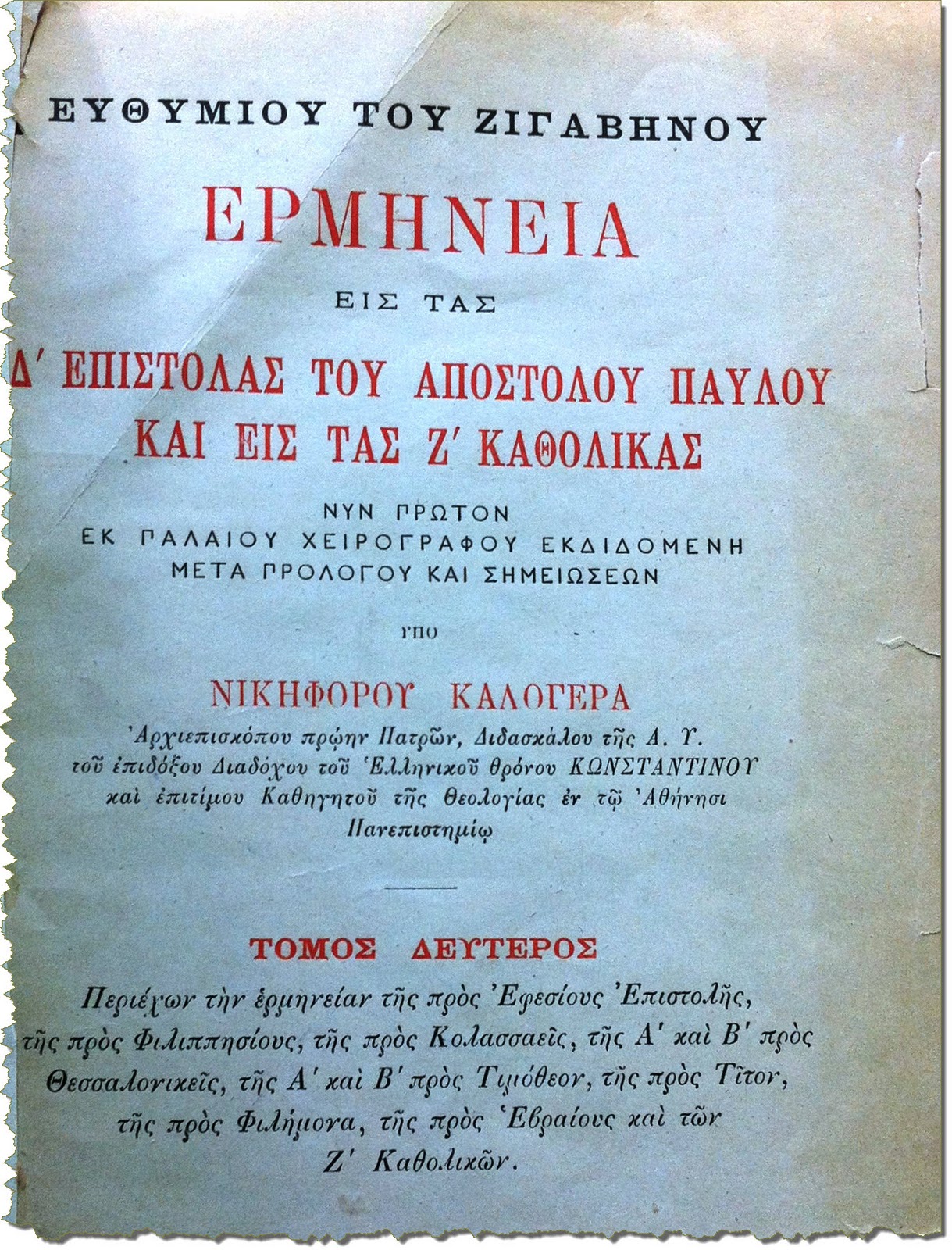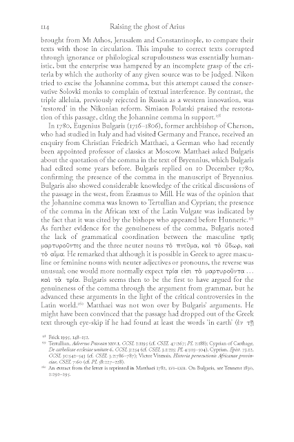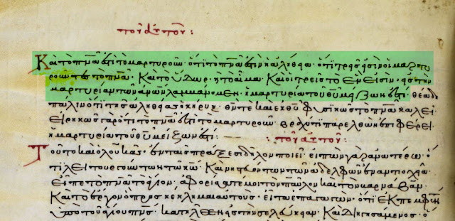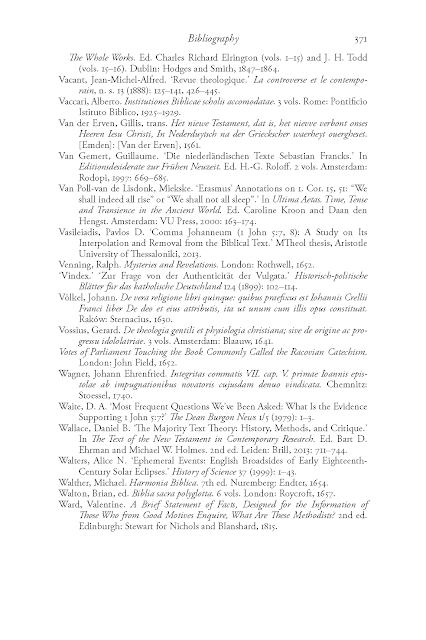 Meanwhile, in 1904, almost simultaneously with the Nestle and Westcott-Hort editions, Professor Vassilios Antoniades of the Halki Theological School in Constantinople prepared an edition of the Byzantine text commissioned by the Holy Synod of the Ecumenical Patriarchate. The purpose was "to restore the most ancient text of the Church's tradition, especially that of the Church of Constantinople." To think: when scholars in Western Europe tried to restore the original text, the Eastern Church was concerned with restoring its own text, not the historically authentic one! In this sense, Antoniades' edition was not intended to be critical. The focus was on the New Testament readings for the liturgical year. Accordingly, Antoniades studied almost exclusively lectionaries in order to restore the liturgical readings, and limited himself to complete New Testament manuscripts with a runing text only in the texts of the New Testament (for example, the Apocalypse), which are not read in the church. But even in the latter case Antoniades chose later (sometimes much later) manuscripts than those of the tenth century. It is telling how in the Introduction Antoniades comments on the famous problem of Comma Johanneum (1 Jn 5:7-8). As an expert on the New Testament, he knew perfectly well that this passage was a very late insertion, not known in the ancient textual tradition, either in the Fathers or in the ancient and medieval translations of the New Testament. So he was going to exclude it. However, the Holy Synod insisted on keeping the passage in the text. Comma Johanneum is a late theological interpretation of 1 John. However, according to the Church's criteria, it is the correct interpretation. This is why the Church has demanded that it be preserved and given it the same canonical status as the rest of the text of 1 John. In other words: the original text has no special significance as such. What matters is the local tradition, which takes precedence if it differs from the original text.